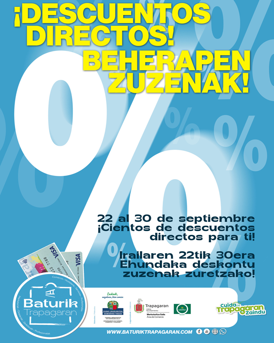 Hasta el 30 de septiembre, realizando tus compras, consumiendo en nuestros establecimientos hosteleros o contratando servicios en Trapagaran puedes conseguir al momento alguno de los cientos de descuentos directos e instantáneos que tenemos reservados. Agarra esta oportunidad que te espera en los establecimientos adheridos a la promoción.