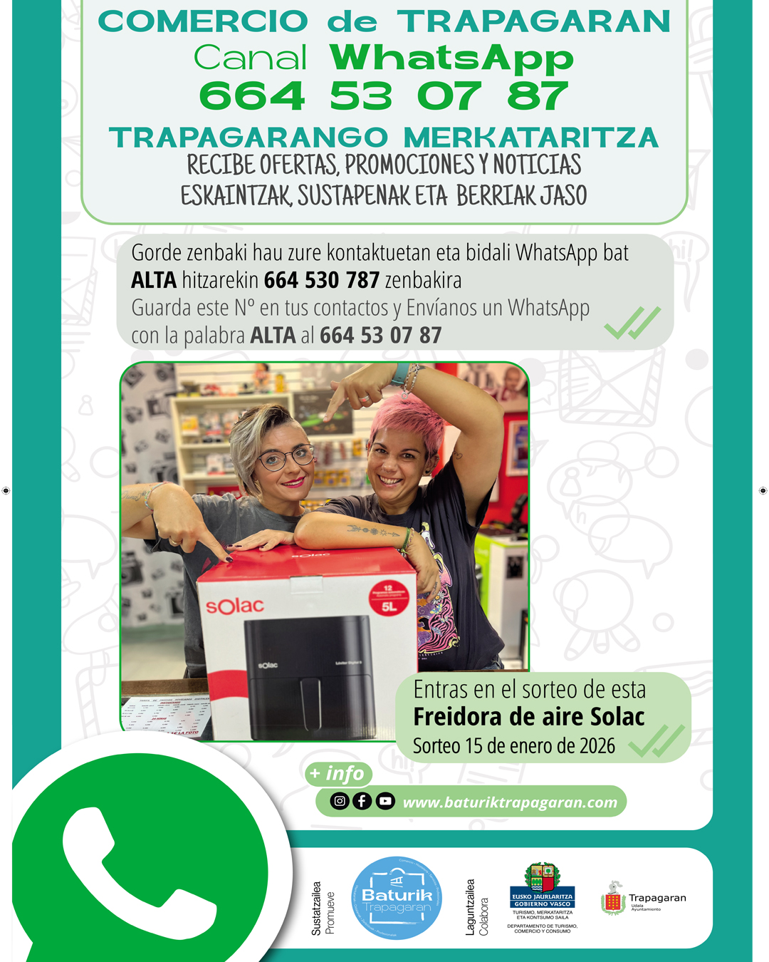 Trapagarango saltokiaren berri, promozio eta bestelako informazioa jaso ahal izateko, interesdunek WhatsApp bidez bidali beharko dute alta hitza 664 53 07 87 zenbakira, eta telefono zenbakia ere gorde beharko dute kontaktuen artean.