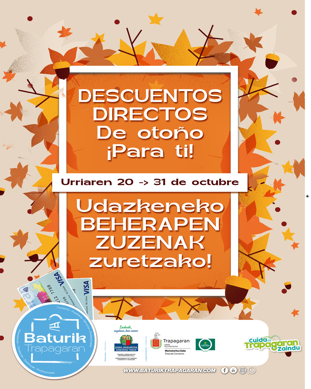 Llegan los descuentos de otoño a Trapagaran. Para conseguirlos solo tienes que consumir en establecimientos de Trapagaran adheridos a la campaña. Establecimientos de todo tipo, en ellos puedes conseguir al momento alguno de los cientos de descuentos directos que hemos guardado para ti. Puedes disfrutar de ellos hasta el 31 de octubre y solo en los establecimientos participantes.